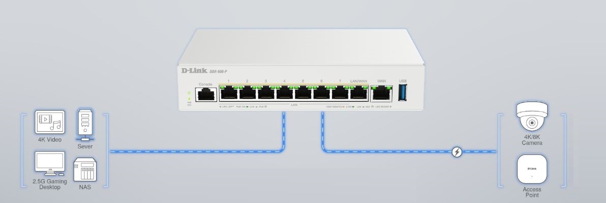 DBR-600-P nabízí vysoce výkonné síťové připojení s 2,5GE WAN portem a osmi 2,5GE PoE porty pro rychlé a spolehlivé připojení.