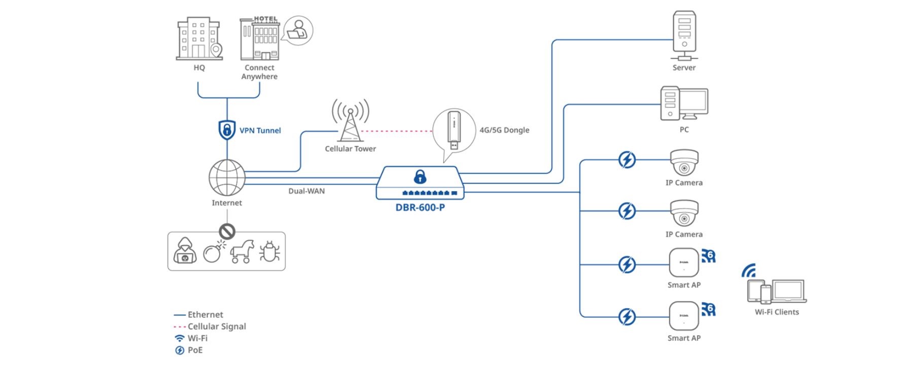 DBR-600-P je vybaven osmi porty PoE, které umožňují síťovým kabelům přenášet data a napájení do zařízení, jako jsou IP kamery, VoIP telefony, bezdrátové AP, čímž eliminují potřebu samostatných zdrojů napájení. To zjednodušuje instalaci, snižuje množství kabelů a nabízí flexibilitu při umisťování zařízení, což umožňuje instalaci v oblastech bez elektrických zásuvek. PoE zvyšuje efektivitu sítě a podporuje aplikace od sledování až po technologie inteligentních budov.