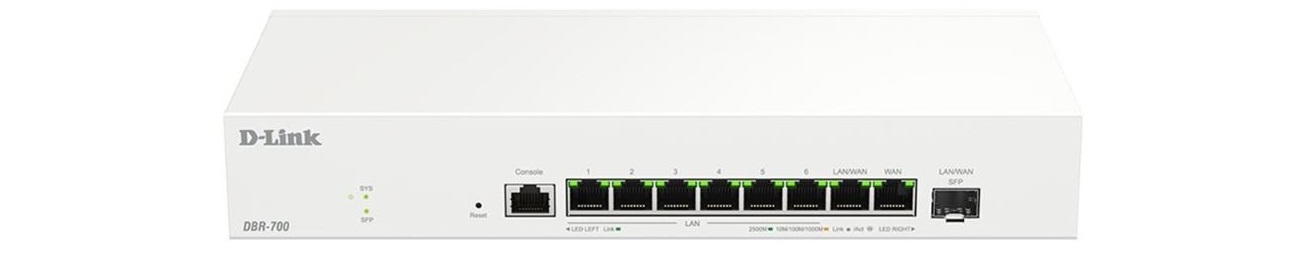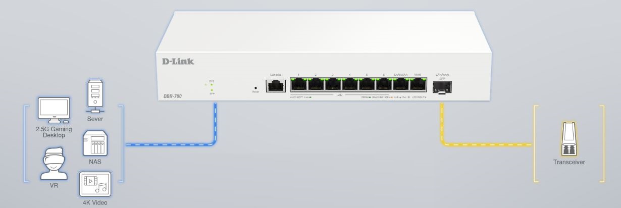 DBR-700 je vybaven 2,5G rozhraním, které poskytuje vyšší šířku pásma pro podporu rychlejšího přenosu souborů a streamování videa ve vysoké kvalitě 4K/8K bez zpoždění, čímž zvyšuje každodenní produktivitu díky stabilnějšímu a spolehlivějšímu připojení. Port SFP (Small Form-Factor Pluggable) umožňuje přenos dat na dlouhé vzdálenosti a nabízí větší flexibilitu a škálovatelnost v síťovém designu. Díky optickému portu mohou firmy snadno škálovat svou síť bez omezení zón.