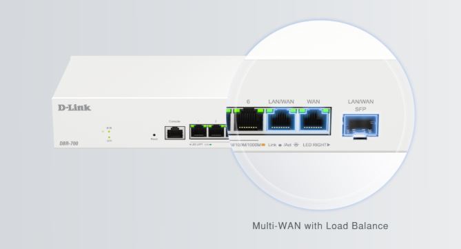 Kromě portu WAN/LAN, který lze konfigurovat jako sekundární WAN, může port SFP sloužit také jako 3. WAN připojení. Funkce Multi-WAN zvyšuje spolehlivost sítě a zajišťuje konzistentní služby. Díky až 3 WAN portům udržuje DBR-700 vaši firmu neustále připojenou. Vyvažování zátěže rozděluje síťový provoz mezi více WAN připojení, čímž zabraňuje přetížení jakéhokoli jednotlivého připojení, průměruje celkové využití internetu a zajišťuje kontinuitu se záložními připojeními v případě selhání.