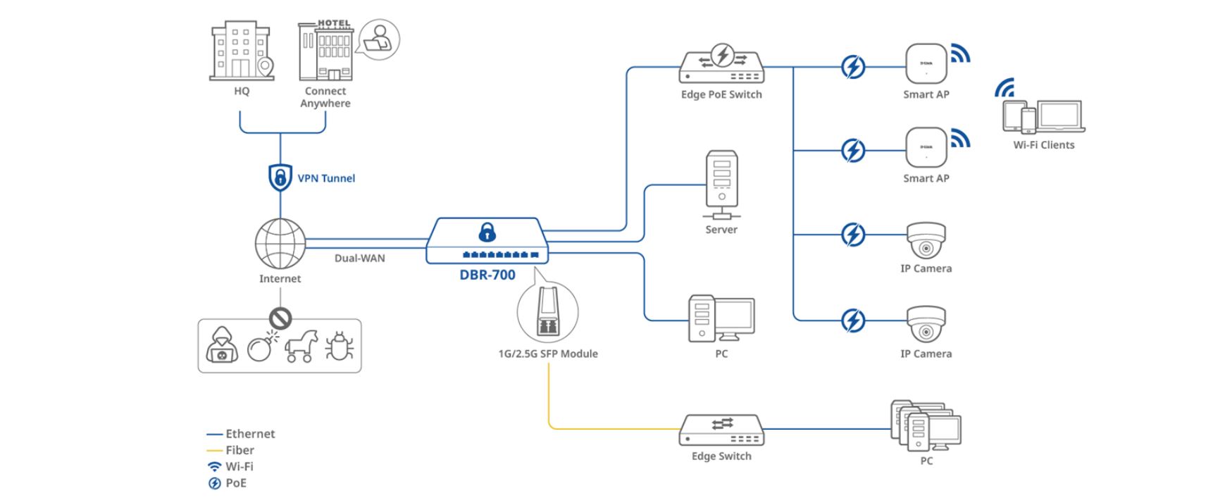 Objevte možnosti firemního routeru DBR-700 prostřednictvím našeho podrobného topologického diagramu. DBR-700 nabízí bezproblémové připojení prostřednictvím svých 2,5G portů s vysokou hustotou, zatímco port SFP umožňuje rozšíření sítě na velké vzdálenosti a flexibilní rozšíření sítě. Více sítí WAN poskytuje spolehlivé a stabilní síťové služby a efektivně vyvažuje provoz. VPN tunel umožňuje uživatelům připojit se k kancelářské síti kdykoli a zajišťuje, že internetová omezení zvyšují produktivitu. Vestavěný systém správy přístupových bodů navíc poskytuje centralizovanou kontrolu nad stavem a ověřováním bezdrátových klientů. DBR-700 je ideální pro firmy, které chtějí optimalizovat výkon a produktivitu sítě.