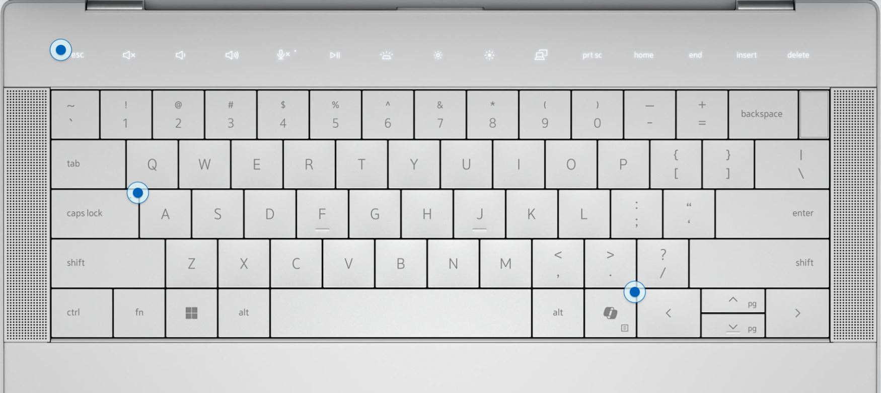 Odborně vyrobeno z obráběného hliníku a Gorily® Glass 3, Dell 14 Premium je navržen tak, aby byl pevný, odolný a pevný. Elegantní, minimalistický design dostupný v platinové i grafitové barvě s povrchovou úpravou tón v tónu. Označení modrých puntíků na klávesnici v tomto pořadí od vrchu dolů: 1) Řada funkcí 2)pohodlná klávesnice 3) Copilot Key.