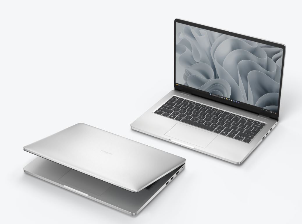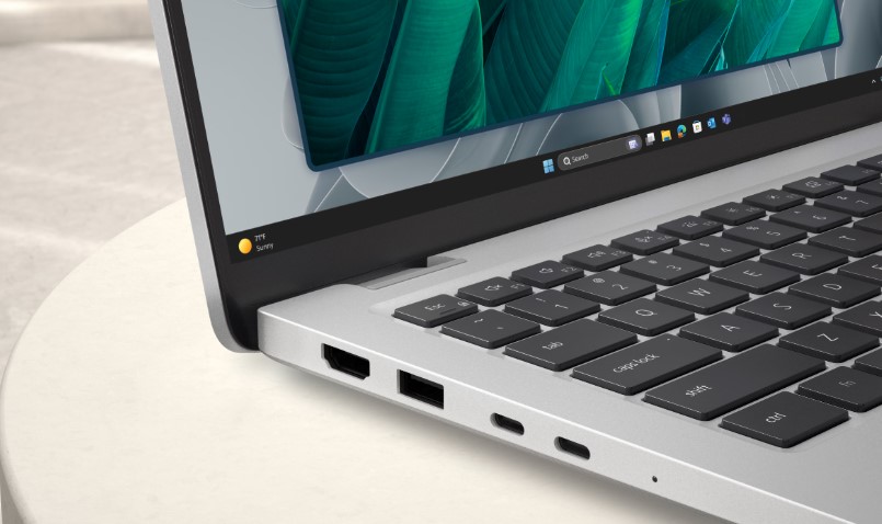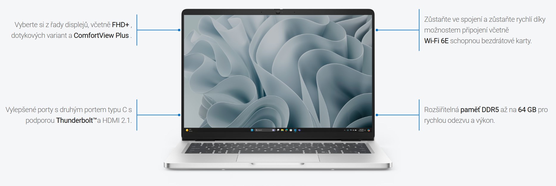 Dell Pro 14 má elegantní kovový povrch v platinově stříbrné barvě a texturovaný povrch v magnetitové barvě.