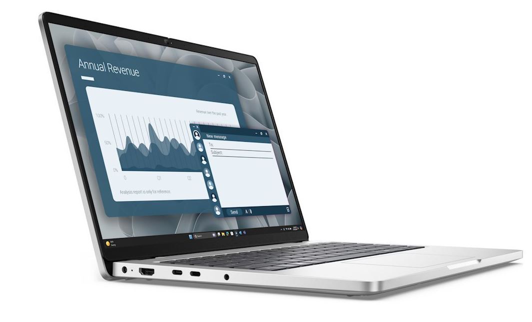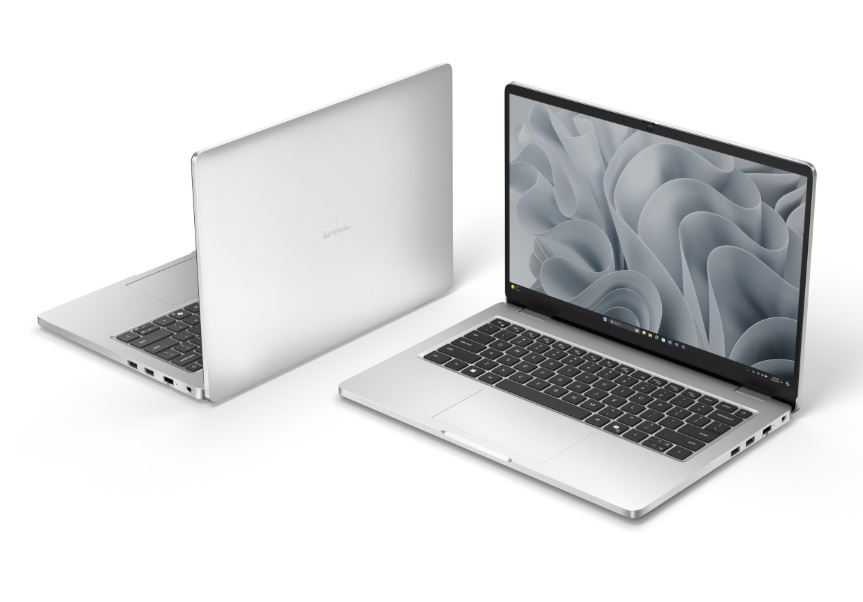 Dell Pro 14 má elegantní kovový povrch v platinově stříbrné barvě a texturovaný povrch v magnetitové barvě.