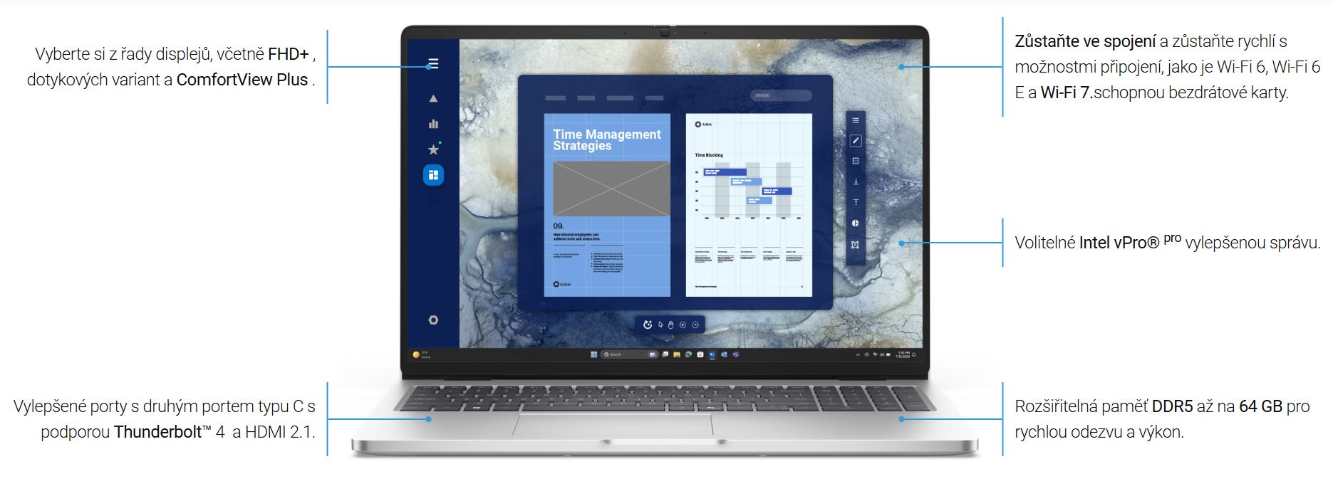 Díky rozsáhlému displeji s poměrem stran 16:10 a elegantními úzkými rámečky má Dell Pro 16 o 10 % větší plochu než předchůdce. To znamená, že můžete pracovat produktivněji na prostornější a detailnější obrazovce.
