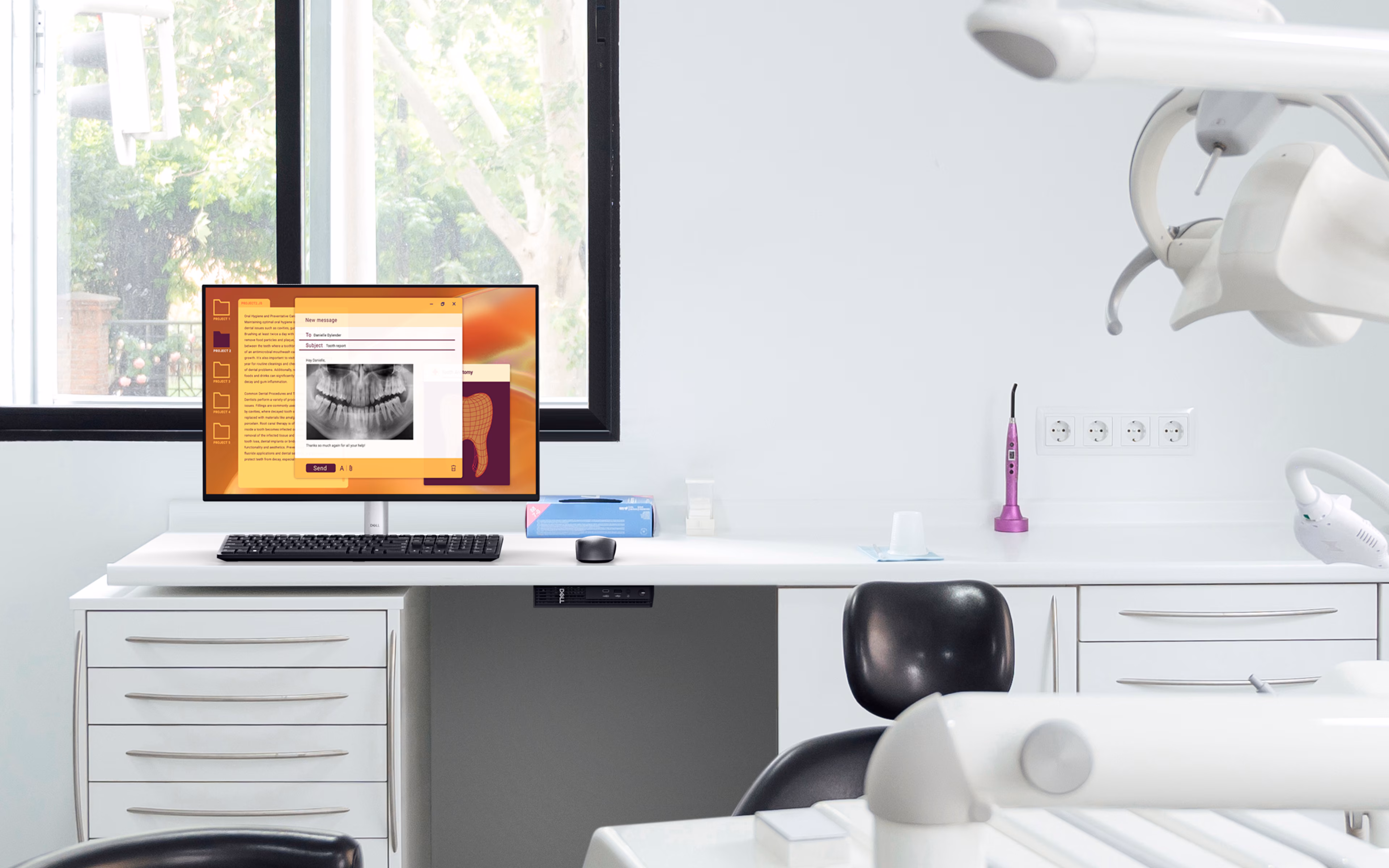 Udržujte svůj pracovní prostor přehledný díky široké škále volitelných držáků a stojanů. Můžete sestavit kompletní systém typu „vše v jednom“ připojením monitoru s rozhraním Dell USB-C Hub ke stojanu Dell Pro Micro All-in-One, nebo jej použít jako součást sestavy Dell pro videokonference.