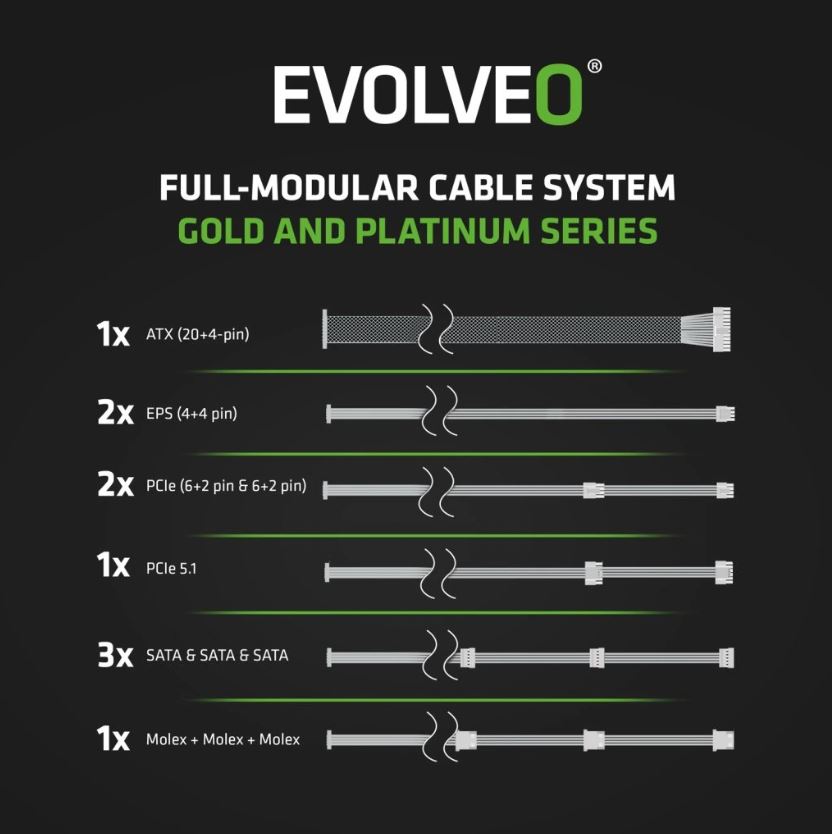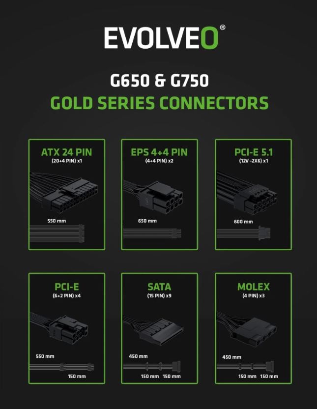 Zapomeňte na zamotané kabely, které brání proudění vzduchu a ještě vaší počítačové skříni kazí styl. Zdroj EVOLVEO G650-BK je plně modulární, takže k němu připojíte jen ty kabely, které opravdu potřebujete. Součástí balení jsou všechny důležité šňůry – jeden kabel ATX 24 PIN, dva EPS 4+4 PIN, dva PCI-E 6+2 PIN, jeden PCI-E 5.1 12V-2×6, tři SATA a jeden MOLEX. Díky tomu máte místo na vše od CPU a GPU přes disky až po vymazlené LED pásky či jiné extra prvky. Vstupní napětí zdroje činí 100–240 V. Součástí zařízení je přitom i 230V vstup na síťový kabel (tento kabel je součástí dodávky).
