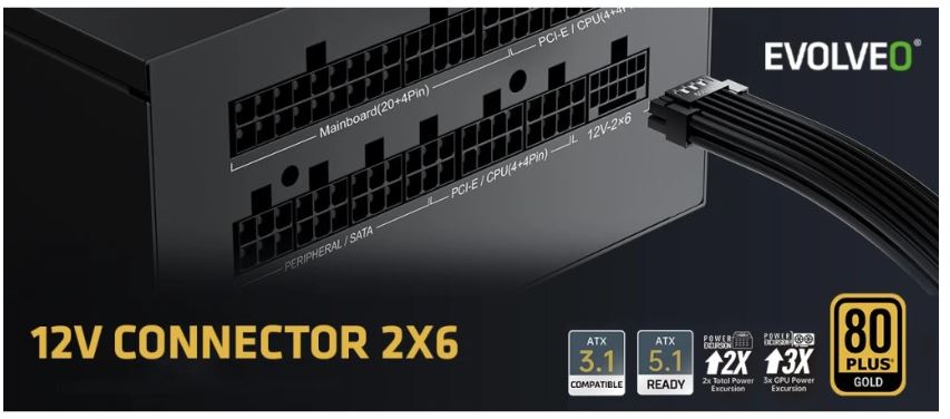 Rozjeďte na svém počítači aktuální herní hit nebo spusťte render náročného videa a pociťte ten masivní příval energie na vlastní kůži. Umožní vám to EVOLVEO G650-BK – herní PC zdroj, s nímž má váš počítač dostatek síly na všechny výzvy dnešního digitálního světa. Tento plně modulární 650W zdroj třídy 80 PLUS Gold je vyvedený v moderním formátu ATX 3.1 a podporuje i standard PCIe 5.1, takže s ním běží jako po másle i náročné grafické karty nové generace. Jeho pořízením si zkrátka zajistíte bezpečné, stabilní a efektivní napájení, které vaše herní doupě napumpuje energií, již si zaslouží.