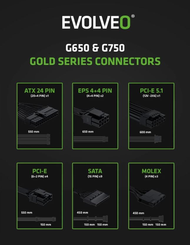 Zapomeňte na zamotané kabely, které brání proudění vzduchu a ještě vaší počítačové skříni kazí styl. Zdroj EVOLVEO G750-BK je plně modulární, takže k němu připojíte jen ty kabely, které opravdu potřebujete. Součástí balení jsou všechny důležité šňůry – jeden kabel ATX 24 PIN, dva EPS 4+4 PIN, dva PCI-E 6+2 PIN, jeden PCI-E 5.1 12V-2×6, tři SATA a jeden MOLEX. Díky tomu máte místo na vše od CPU a GPU přes disky až po vymazlené LED pásky či jiné extra prvky. Vstupní napětí zdroje činí 100–240 V. Součástí zařízení je přitom i 230V vstup na síťový kabel (tento kabel je součástí dodávky).