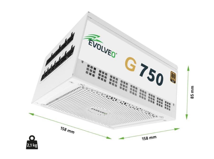 Se šířkou pouhých 158 mm se zdroj EVOLVEO G750-BK vejde i do menších PC skříní či stylových towerů. Přitom si zachovává sílu 750 W, takže utáhne i grafiku aktuální generace – třeba NVIDIA® GeForce RTX™ řady 40 nebo 50. Celkové dojmy z tohoto počítačového zdroje pak dotahuje k dokonalosti robustní konstrukce s plechy o tloušťce 0,7 mm nebo kvalitně zpracovaný hlavní síťový vypínač. Vzhledem k certifikacím LVD, EMC a RoHS zdroj odpovídá nejpřísnějším evropským normám.