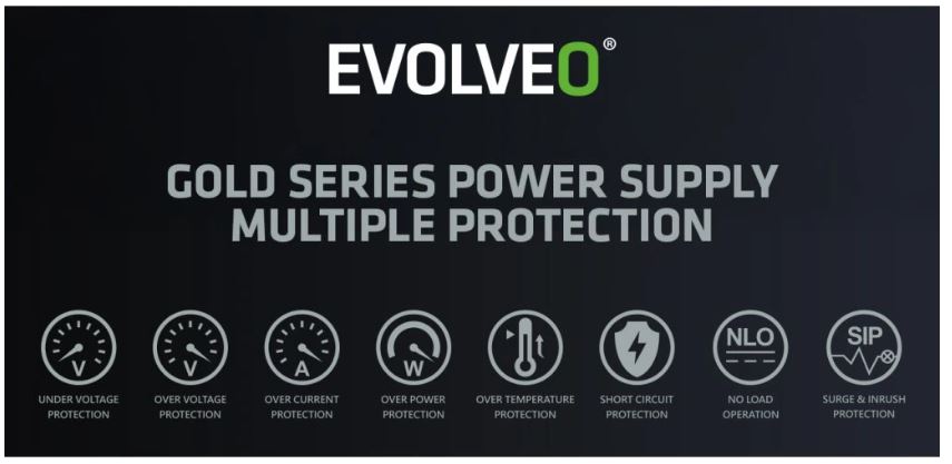 Při extrémních herních výzvách oceníte na tomto zdroji i sadu 8 stupňů ochrany, která vás jako rytířské brnění chrání před řadou nástrah. Over Temperature, Over Voltage, Under Voltage, Over Current, Over Power, No Load Operation, Surge & Inrush – to jsou pojistky, díky nimž vás nezaskočí přehřátí, přepětí, zkrat ani nárazový proud. Daleko pravděpodobněji vás překvapí váš nový rekord v době nepřetržitého hraní.