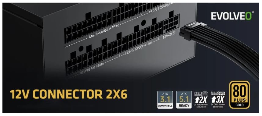 Rozjeďte na svém počítači aktuální herní hit nebo spusťte render náročného videa a pociťte ten masivní příval energie na vlastní kůži. Umožní vám to EVOLVEO G750-BK – herní PC zdroj, s nímž má váš počítač dostatek síly na všechny výzvy dnešního digitálního světa. Tento plně modulární 750W zdroj třídy 80 PLUS Gold je vyvedený v moderním formátu ATX 3.1 a podporuje i standard PCIe 5.1, takže s ním běží jako po másle i náročné grafické karty nové generace.