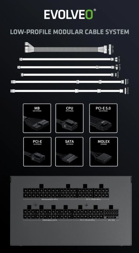 Zapomeňte na zamotané kabely, které brání proudění vzduchu a ještě vaší počítačové skříni kazí styl. Zdroj EVOLVEO G850-BK je plně modulární, takže k němu připojíte jen ty kabely, které opravdu potřebujete. Součástí balení jsou všechny důležité šňůry – jeden kabel ATX 24 PIN, dva EPS 4+4 PIN, dva PCI-E 6+2 PIN, jeden PCI-E 5.1 12V-2×6, tři SATA a jeden MOLEX. Díky tomu máte místo na vše od CPU a GPU přes disky až po vymazlené LED pásky či jiné extra prvky. Vstupní napětí zdroje činí 100–240 V. Součástí zařízení je přitom i 230V vstup na síťový kabel (tento kabel je součástí dodávky).