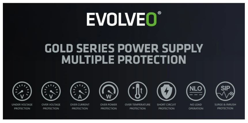 C zdroj EVOLVEO G850-BK je hrdým držitelem certifikace 80 PLUS Gold, která slibuje až 92% účinnost (při běžném 50% zatížení). Minimální ztráty energie a nízké zahřívání jdou přitom ruku v ruce s tichým chodem 140mm HDB ventilátoru – ten má mezi hřídelí a ložisky speciální olejovou vrstvu a jeho tření je nepatrné, takže hlučnost zůstává na minimu. S tímto zdrojem vás zkrátka hučení ventilátoru neruší – slyšet je jen svištění kol vaší formule nebo řinčení zbraní vaší armády. Prémiové japonské kondenzátory, jimiž je tento zdroj vybaven, jsou spolehlivé a extra výkonné. Navíc odolávají teplotám až 105 °C. A jejich životnost? Až 20 let!