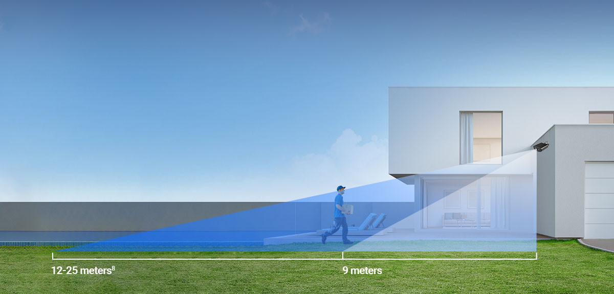 Když je funkce AOV zapnutá, může kamera detekovat blížící se osobu nebo vozidlo na mnohem větší vzdálenost. Pokud se v záběru kamery objeví osoba nebo vozidlo, i když jsou mimo dosah PIR čidla, kamera to zaznamená a okamžitě vás o tom informuje.