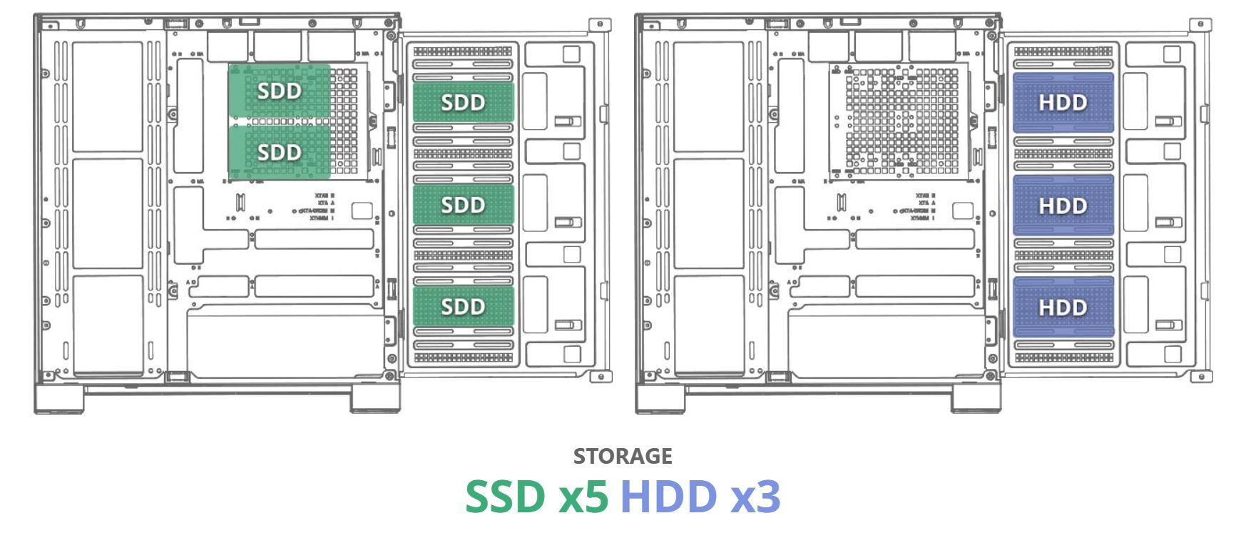 Speciální držák disků je vybaven snadno instalovatelným mechanismem ve stylu dvířek, který umožňuje snadný přístup a bezpečnou instalaci až 5 SSD nebo 3 HDD. Tento inovativní design maximalizuje využití prostoru a zároveň udržuje vaši sestavu přehlednou a organizovanou. Je navržen s ohledem na funkčnost i estetiku a hladce integruje vaše úložné potřeby, aniž by narušil elegantní vzhled skříně.