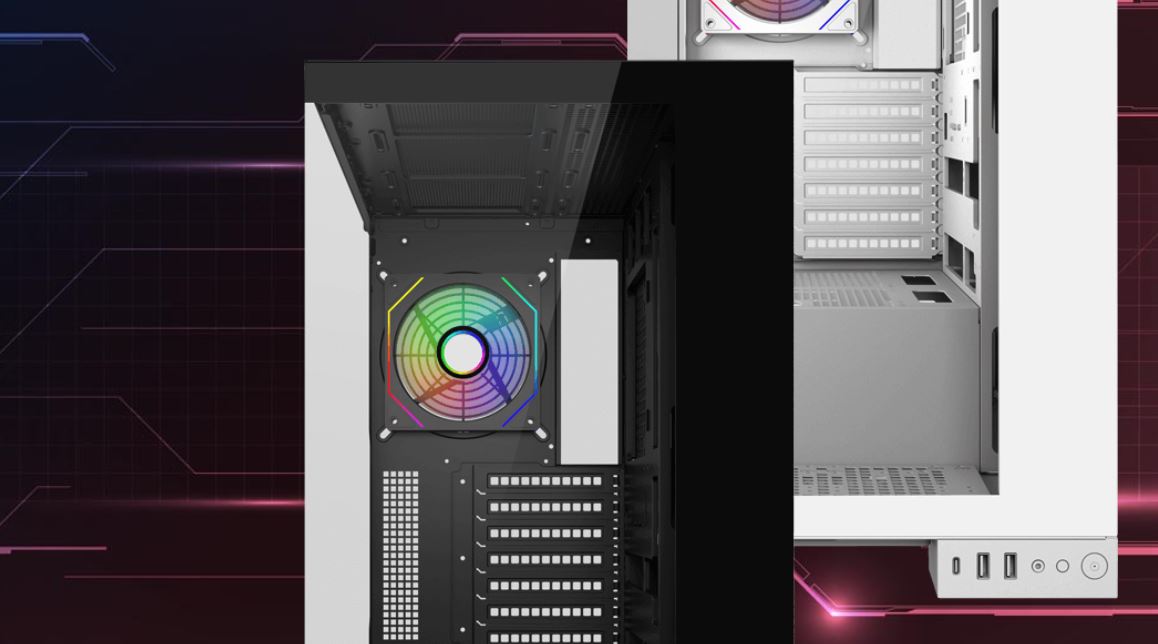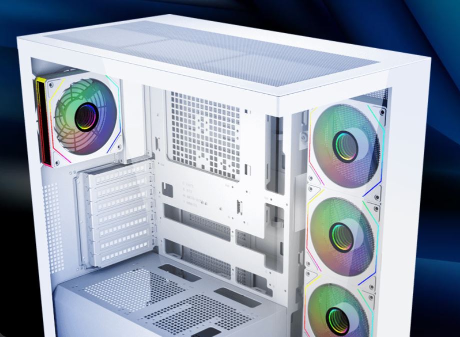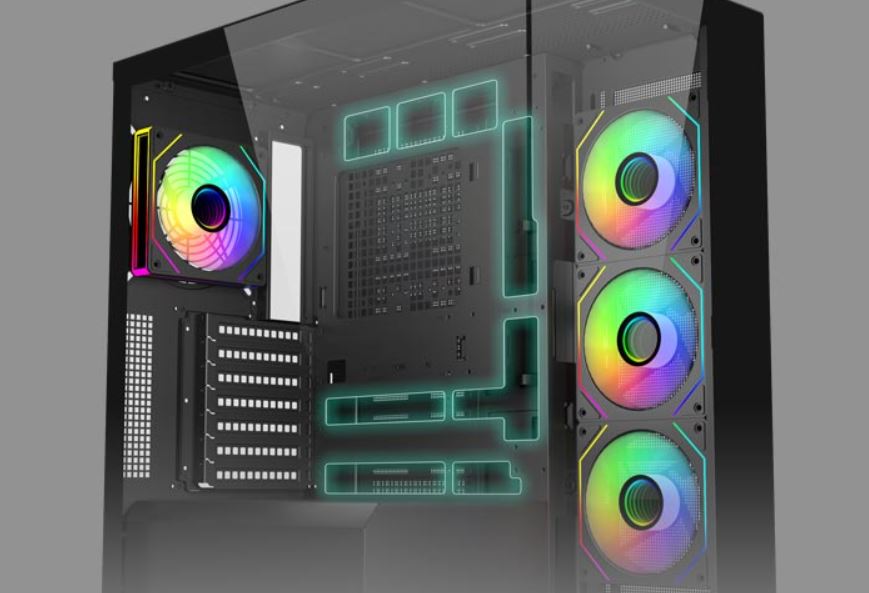 Na boku jsou umístěny tři reverzní tiché ventilátory ARGB, zatímco zadní strana je vybavena ventilátorem ARGB.
