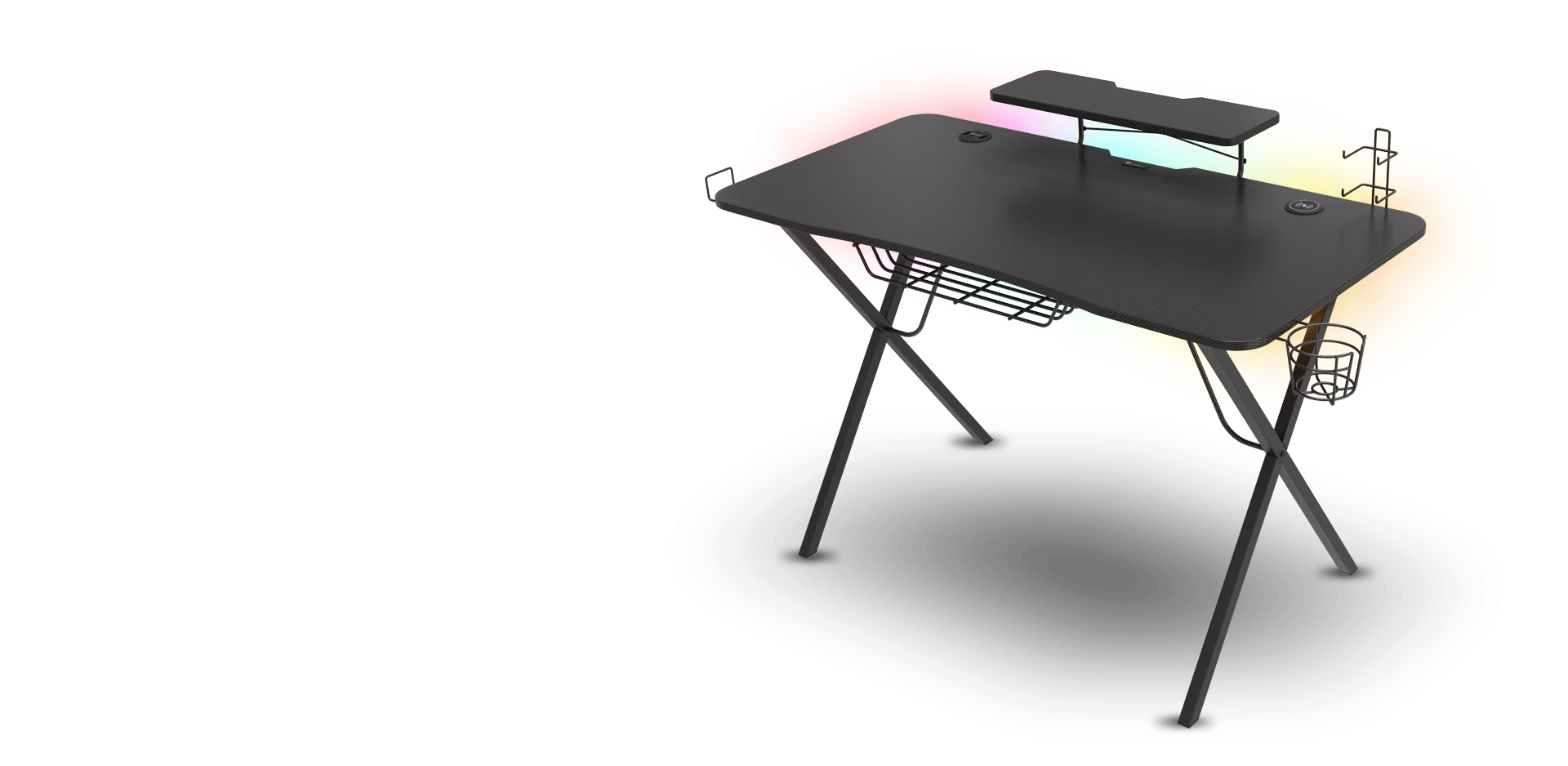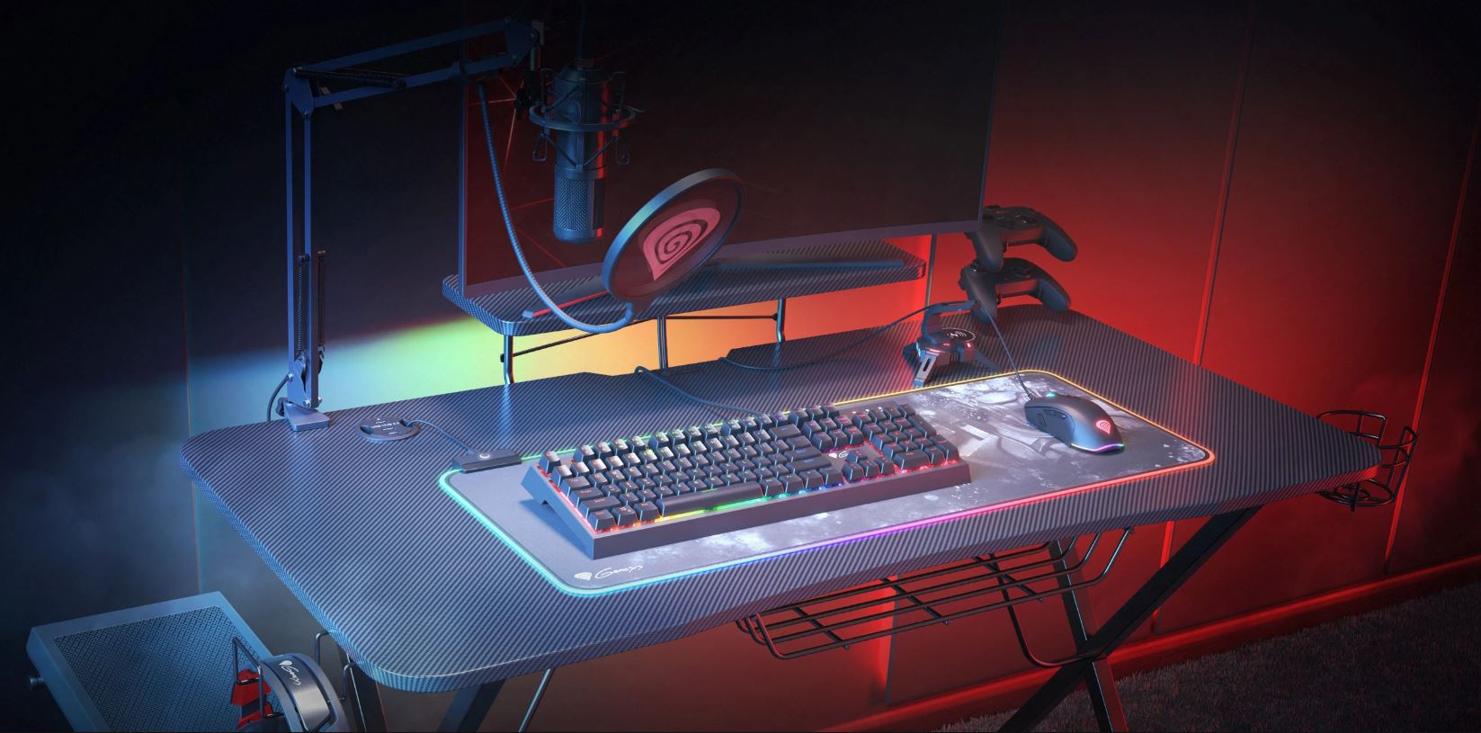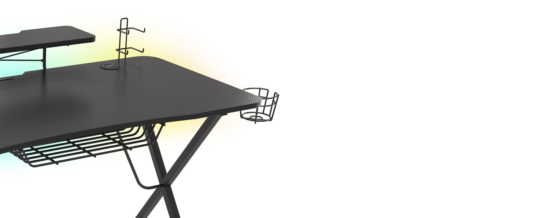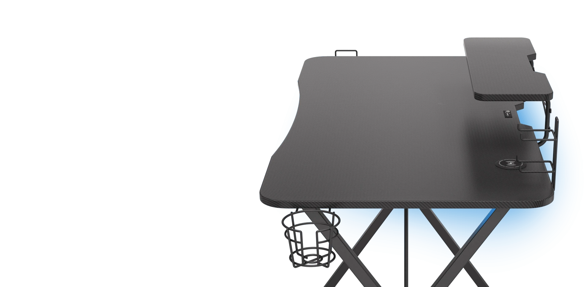 Genesis Holm 300 RGB je vybaven kovovými držáky na sluchátka a gamepady. Abyste přežili celonoční sezení, můžete si do speciálního držáku uschovat energetický nápoj nebo šálek oblíbené kávy. Držáky mají univerzální uchycení, takže je můžete umístit na pravou nebo levou stranu, podle toho, co vám lépe vyhovuje. Pro udržení pořádku na stole je zespodu umístěna přihrádka na napájecí lištu, která slouží k uspořádání kabelů. V přední části můžete navíc připevnit odkládací plochu, která nejlépe poslouží pro vaše příruční předměty nebo občerstvení.
