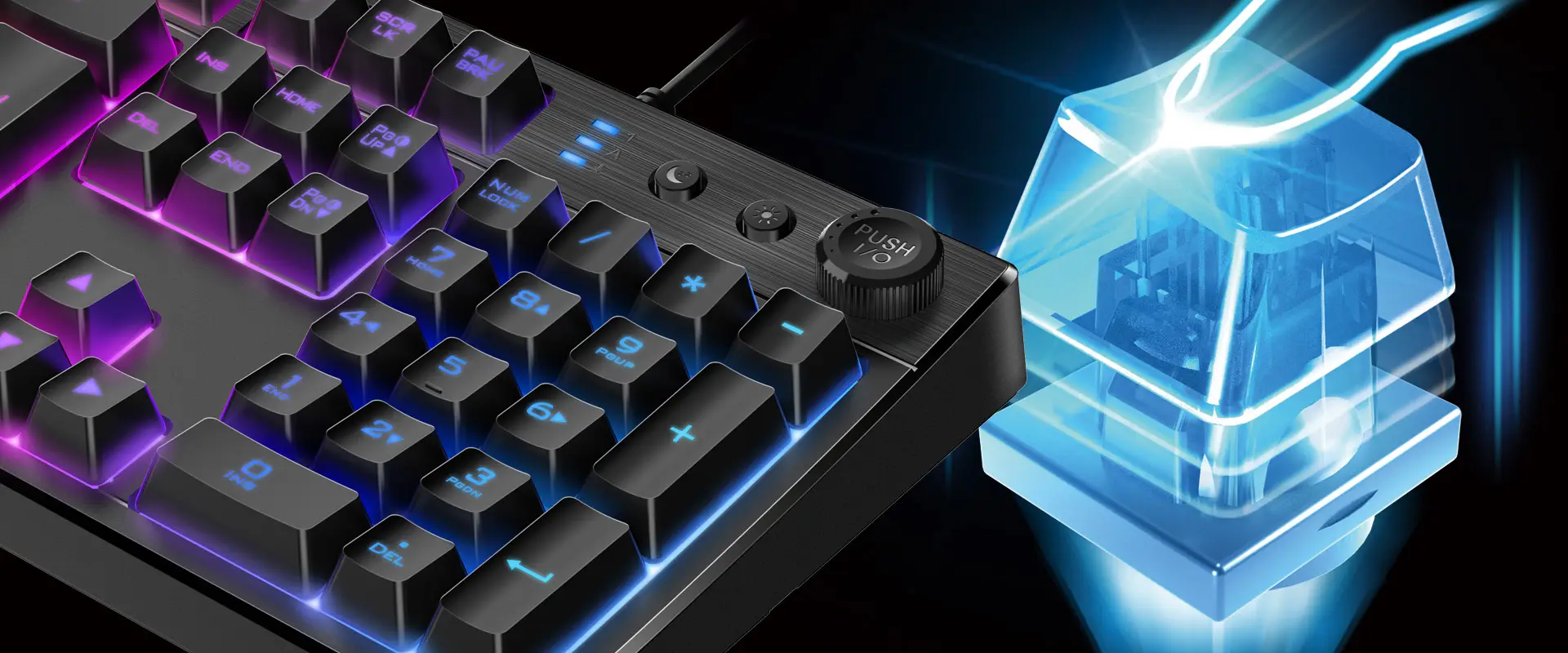 Užijte si hmatový pocit mechanické klávesnice kombinovaný s praktickým ovládacím knoflíkem, přednastaveným pro snadné nastavení hlasitosti.