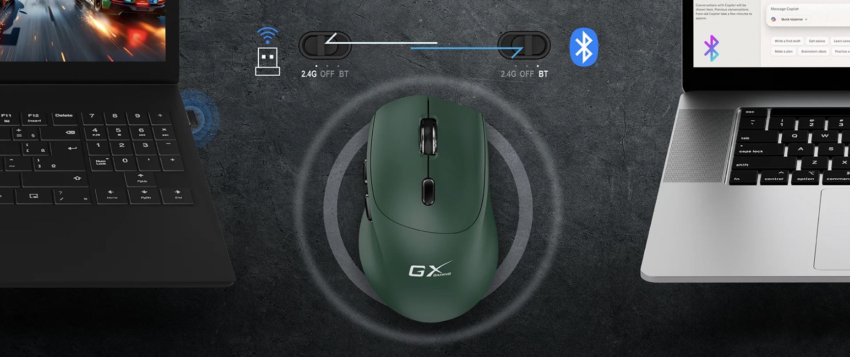 Snadno přepínejte mezi Bluetooth, 2.4GHz a režimem vypnutí pro rychlé nastavení a spolehlivé připojení.