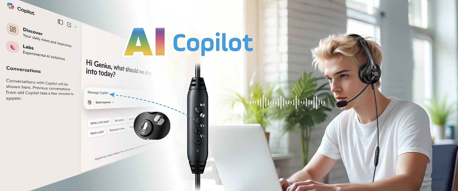 Čistý mikrofon a ovládání na kabelu pro rychlý přístup k hlasitosti, ztlumení, hovorům a AI Copilot.