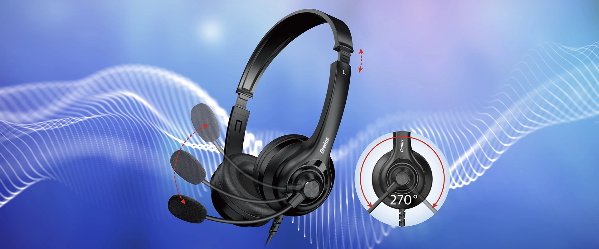 Mikrofon nastavitelný v rozsahu 270° a nastavitelný náhlavní pásek pro individuální přizpůsobení a přesný příjem hlasu – pohodlné nošení na obou uších.
