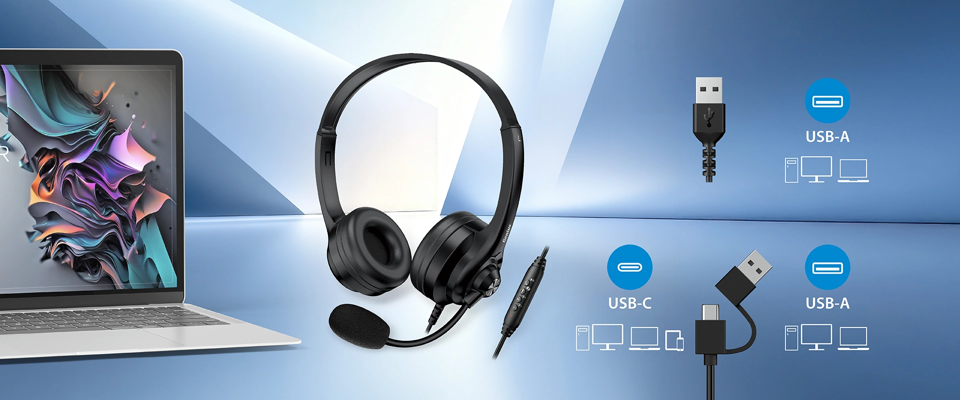 Plug-and-play přes USB-A or USB-C pro rychlé nastavení na většině zařízení.