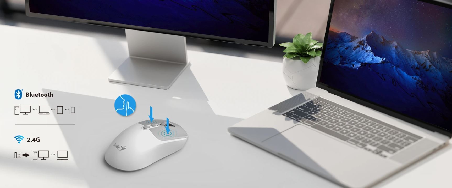 NX-8080S BT je myš s více způsoby připojení, která funguje s 2.4G a Bluetooth. Kliká tiše, což je ideální do knihoven a kanceláří.