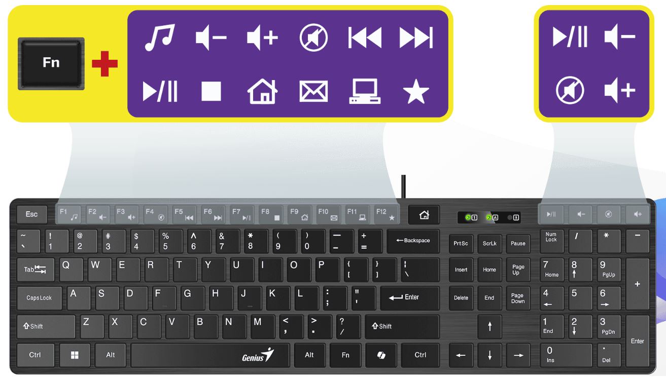 12 multimediálních funkčních kláves a 4 vyhrazené horké klávesy pro rychlé příkazy