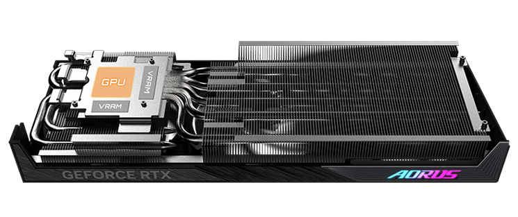 Měděná deska se přímo dotýká grafického procesoru a ve spojení s kompozitními měděnými tepelnými trubicemi rychle přenáší teplo z grafického procesoru a VRAM do chladiče.