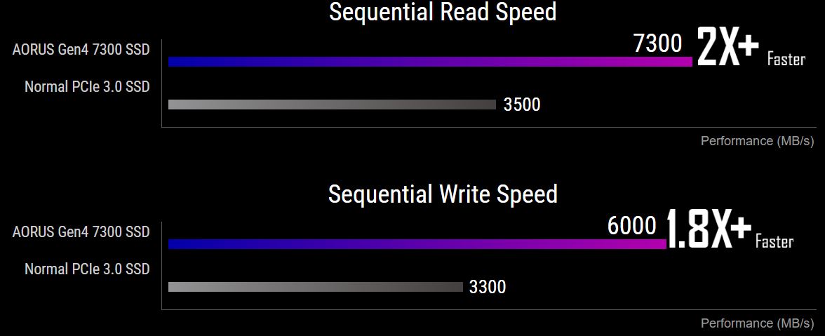 Díky využití řadiče Phison E18 a 3D TLC NAND paměti nabízí disk AORUS Gen4 7300 SSD ohromující rychlosti: až 7 300 MB/s pro sekvenční čtení a až 6 000 MB/s pro sekvenční zápis. Výkon sekvenčního čtení disků SSD s rozhraním PCIe 4.0 je dvakrát rychlejší než u disků SSD s rozhraním PCIe 3.0. Připravte se na vstup do nové generace výpočetní techniky s rychlejším a plynulejším hraním her, streamováním a graficky náročným vykreslováním.