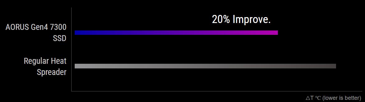 V porovnání s běžným rozdělovačem tepla nový vysoce účinný rozdělovač zlepšuje odvod tepla a prodlužuje tak dobu provozu při vysoké rychlosti o 46 %. Navíc ve srovnání s diskem bez chladiče běží AORUS Gen4 7300 SSD 5krát déle při rychlosti 7,3 GB/s. Užijte si plynulejší a vylepšený úložný výkon.