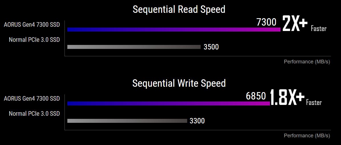 Díky využití řadiče Phison E18 a 3D TLC NAND paměti nabízí disk AORUS Gen4 7300 SSD ohromující rychlosti: až 7 300 MB/s pro sekvenční čtení a až 6 850 MB/s pro sekvenční zápis. Výkon sekvenčního čtení disků SSD s rozhraním PCIe 4.0 je dvakrát rychlejší než u disků SSD s rozhraním PCIe 3.0. Připravte se na vstup do nové generace výpočetní techniky s rychlejším a plynulejším hraním her, streamováním a graficky náročným vykreslováním.