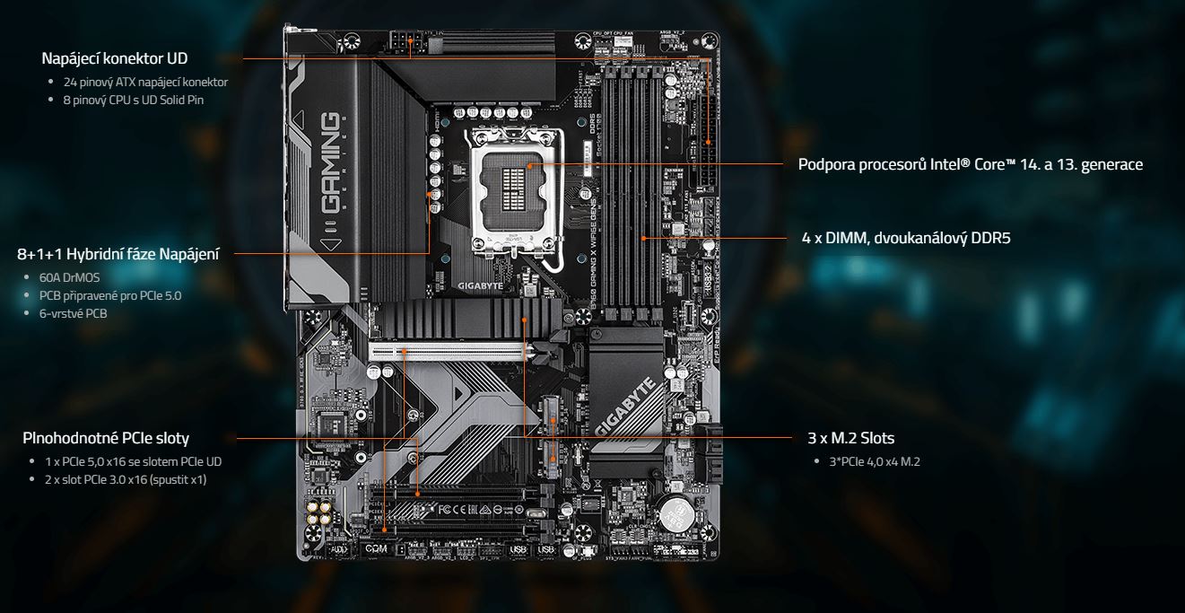 Nové základní desky GIGABYTE B760 poskytují nejúčinnější řešení, jak si užít zvýšený výkon PCIe Gen5 na stávající platformě. PCIe 5.0 zdvojnásobuje rychlost přenosu dat PCIe 4.0 z 16 GT/s na 32 GT/s na pruh. Toto podstatné zvýšení šířky pásma prospívá zejména vysoce výkonným grafickým kartám, úložným zařízením a akcelerátorům umělé inteligence, které vyžadují rychlejší pohyb dat.