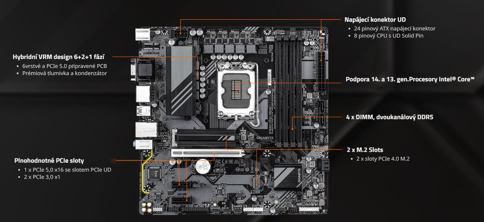 Nové základní desky GIGABYTE B760 poskytují nejúčinnější řešení, jak si užít zvýšený výkon PCIe Gen5 na stávající platformě. PCIe 5.0 zdvojnásobuje rychlost přenosu dat PCIe 4.0 z 16 GT/s na 32 GT/s na pruh. Toto podstatné zvýšení šířky pásma prospívá zejména vysoce výkonným grafickým kartám, úložným zařízením a akcelerátorům umělé inteligence, které vyžadují rychlejší pohyb dat.