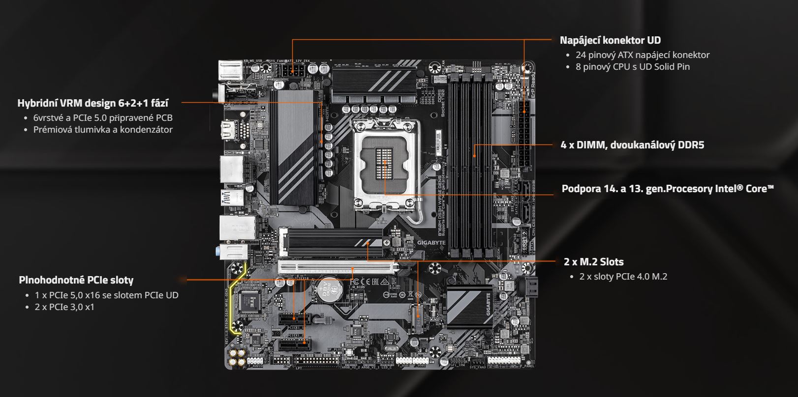 Nové základní desky GIGABYTE B760 poskytují nejúčinnější řešení, jak si užít zvýšený výkon PCIe Gen5 na stávající platformě. PCIe 5.0 zdvojnásobuje rychlost přenosu dat PCIe 4.0 z 16 GT/s na 32 GT/s na pruh. Toto podstatné zvýšení šířky pásma prospívá zejména vysoce výkonným grafickým kartám, úložným zařízením a akcelerátorům umělé inteligence, které vyžadují rychlejší pohyb dat.
