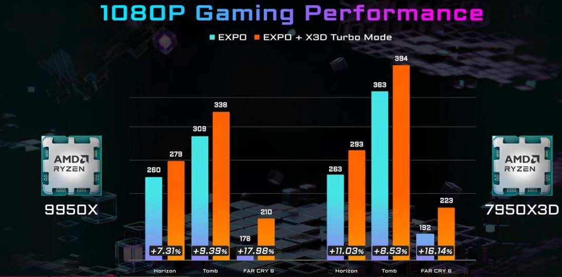 Jedinečné optimalizační parametry X3D Turbo Mode umožňují dokonce i procesorům Ryzen™ 9000 X3D gaming Performance enhance & Ryzen™ 9000 non-X3D dosáhnout podobných úrovní herního výkonu jako jejich protějšky Ryzen™ X3D. Zažijte plynulejší hratelnost, vyšší snímkovou frekvenci a sníženou latenci díky inovaci systému BIOS společnosti GIGABYTE - X3D Turbo Mode.