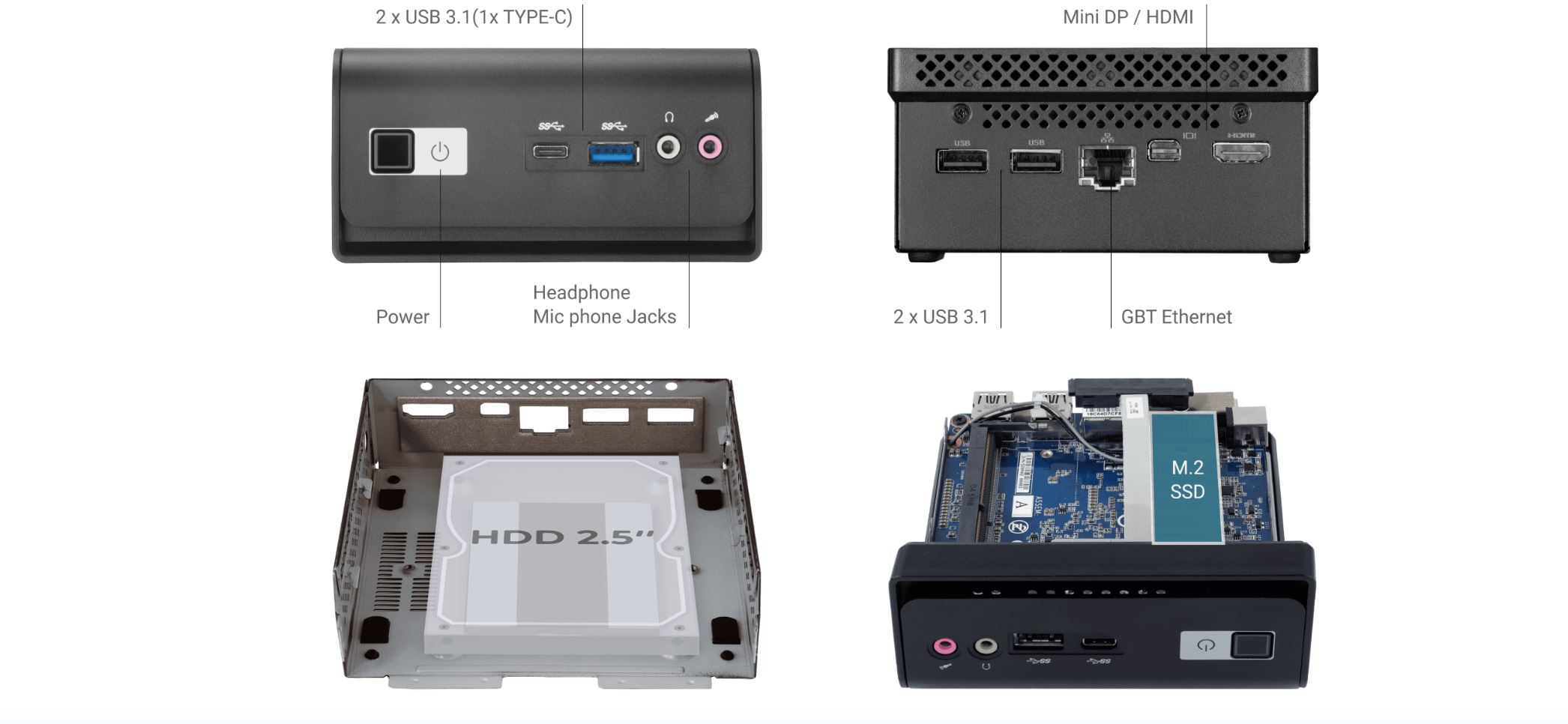 Mini PC GIGABYTE BRIX s nejnovějšími 10nm procesory Intel Pentium Silver/ Celeron nabízí řadu užitečných konektorů na I/O panelu. Je vybavený až 4 porty USB 3.1 s jedním nejnovějším USB Type-C, konektory sluchátek a mikrofonu pro HD audio a praktickými obrazovými výstupy HDMI 2.0+ a mDP, které uživateli umožňují připojit jakýkoliv typ monitoru. Gigabitový ethernet urychluje připojení k internetu či intranetu.
