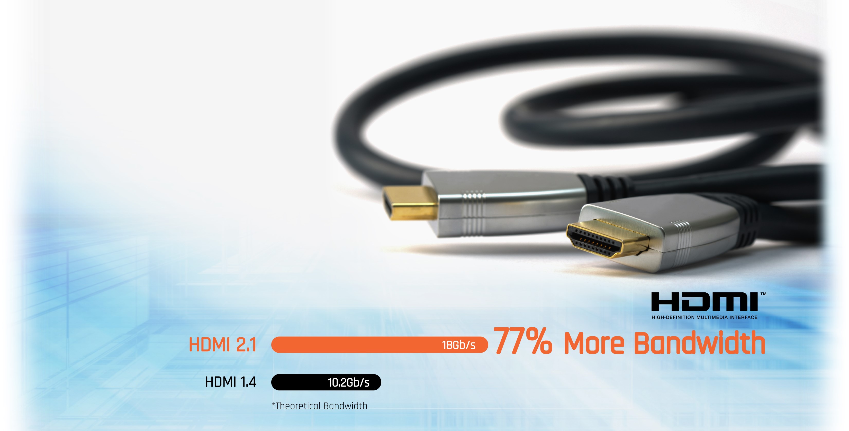 HDMI 2.1 nabízí šířku pásma 18 Gb/s, což je téměř dvojnásobek oproti předchozí generaci, a je také zpětně kompatibilní s HDMI 1.4.