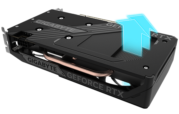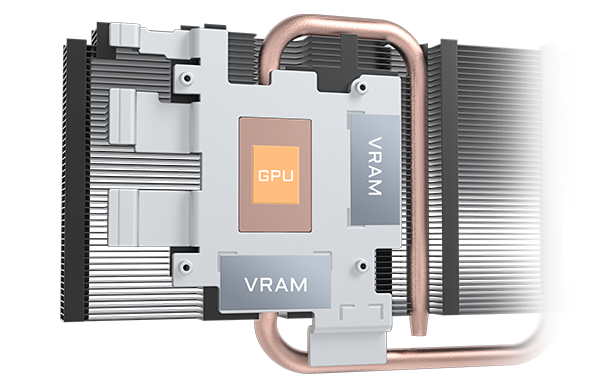 Měděná deska je v přímém kontaktu s GPU a je spojena s kompozitními měděnými tepelnými trubicemi, které rychle přenášejí teplo z GPU a VRAM do chladiče.
