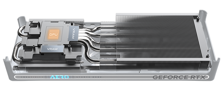 Měděná deska se přímo dotýká grafického procesoru a ve spojení s kompozitními měděnými tepelnými trubicemi rychle přenáší teplo z grafického procesoru a VRAM do chladiče.