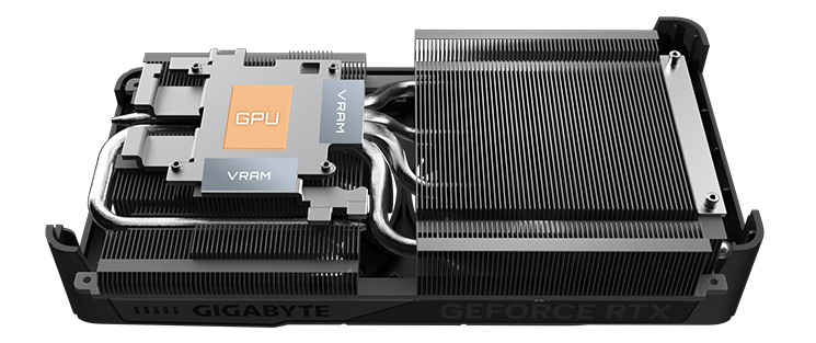 Měděná deska se přímo dotýká grafického procesoru a ve spojení s kompozitními měděnými tepelnými trubicemi rychle přenáší teplo z grafického procesoru a VRAM do chladiče.
