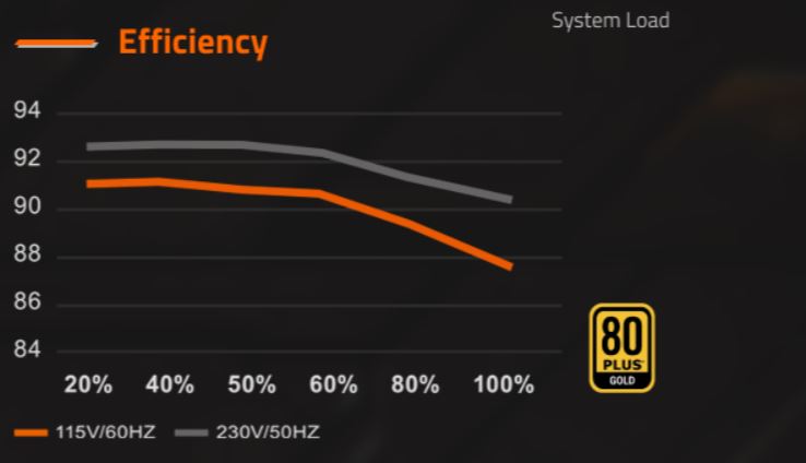 Certifikace 80 Plus Gold zajišťuje 90% účinnost při 50% zatížení. Lepší energetická účinnost vede k menšímu plýtvání energií, menšímu teplu a menšímu hluku ventilátoru.