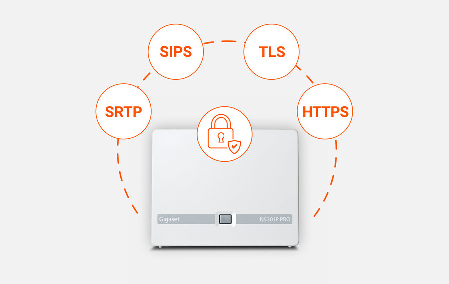 Základní stanice Gigaset N530 IP PRO nabízí komplexní ochranu firemní komunikace – interní i externí. Použitá technologie DECT je digitální a šifrovaná, takže bezdrátové odposlechy jsou technicky vyloučeny. Navíc end-to-end zabezpečení na úrovni sítě pomocí SRTP, SIPS, TLS a HTTPS zajišťuje šifrovanou signalizaci a přenos hlasu. Systém tak splňuje nejvyšší bezpečnostní požadavky a spolehlivě chrání před neoprávněným přístupem – což je důležitý předpoklad pro profesionální uživatele.