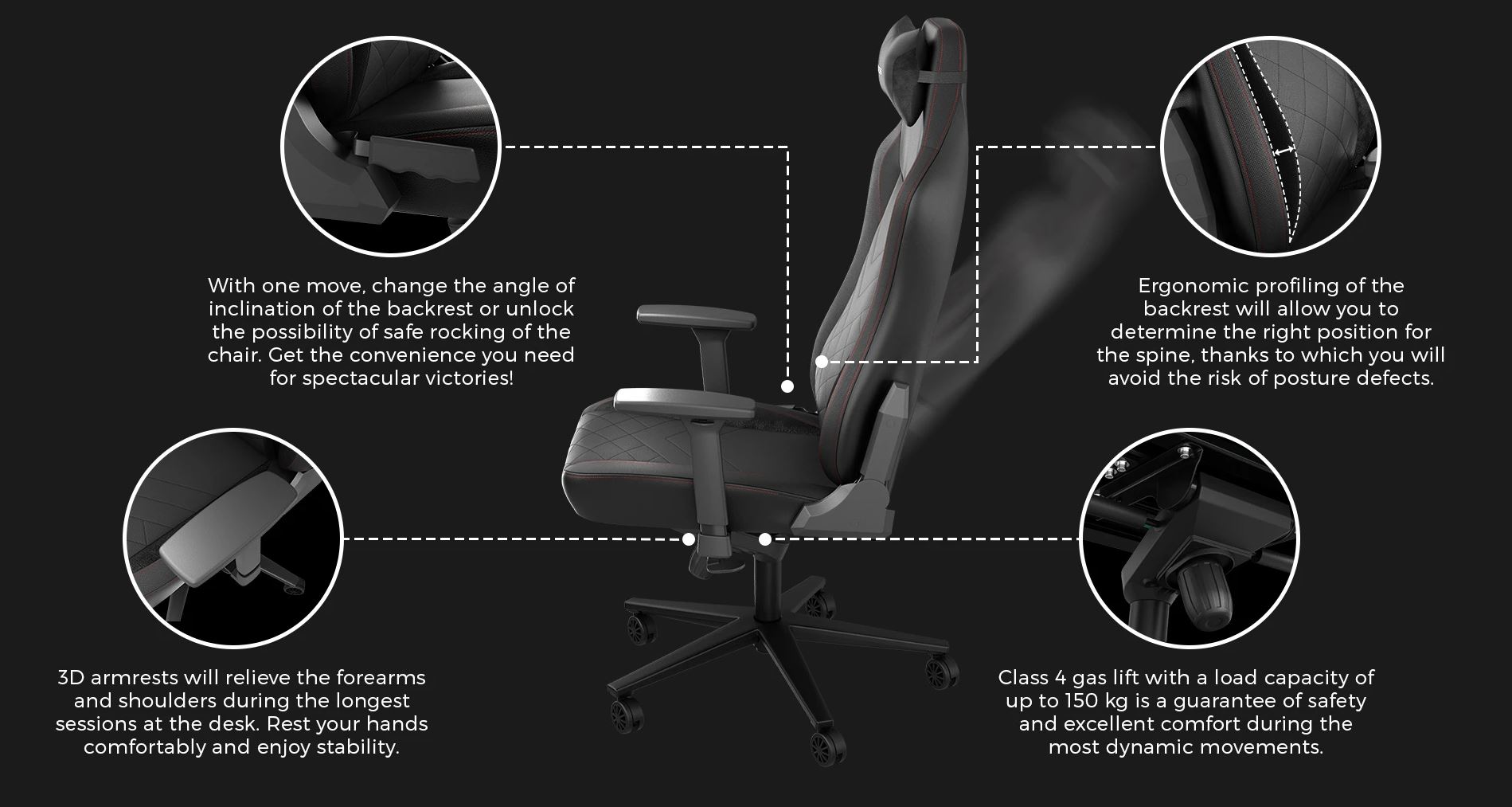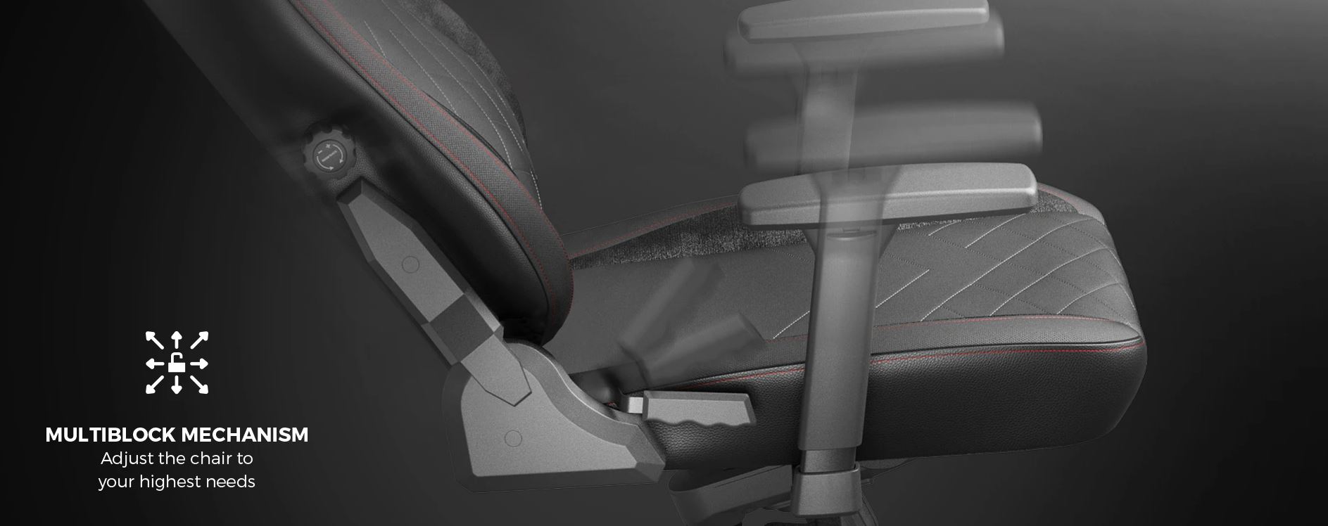 Třícestně nastavitelné područky umožňují pohodlné nastavení, výškové nastavení vám pomůže správně nastavit židli podle vaší výšky. Po náročné hře si budete moci odpočinout díky funkci houpání - multiblock. Dopřejte si chvilku relaxace a před dalším bojem zafixujte opěradlo v požadované poloze a užijte si neochvějnou stabilitu.