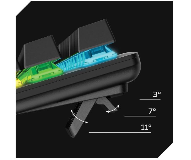 Nastavte dvoustupňové nožičky klávesnice pro tři různá nastavení úhlu (3°, 7° nebo 11°), podle toho, které vám bude nejpohodlnější pro zápěstí.