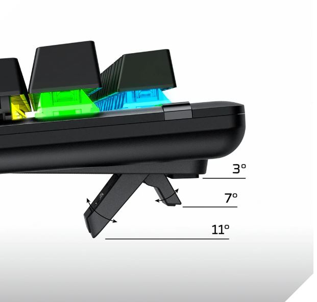 Nastavte si dvoustupňové nožičky klávesnice do tří různých úhlů (3°, 7° nebo 11°), podle toho, které vám bude nejpohodlnější pro zápěstí.
