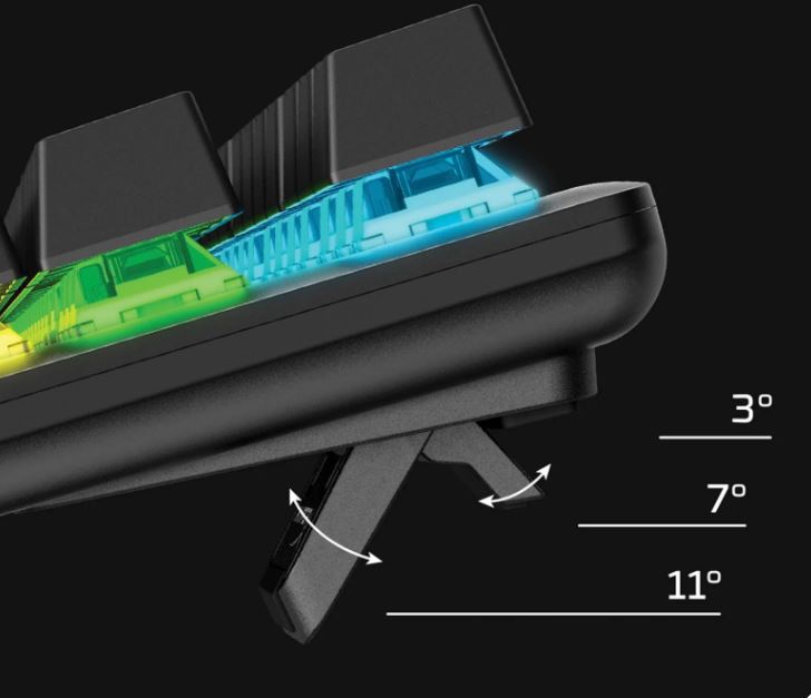 Upravte dvoustupňové nohy klávesnice pro tři různá nastavení úhlu (3°, 7° nebo 11°), podle toho, co dělá vaše zápěstí nejpohodlnější.