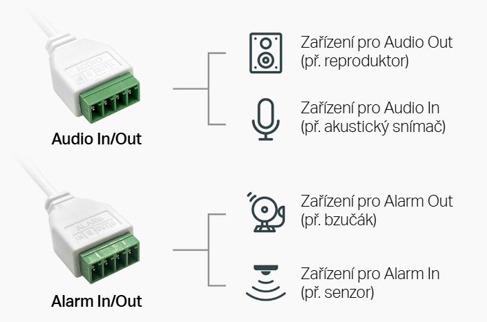- Alarm I/O: 1 vstup / 1 výstup