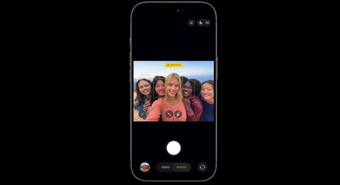 Nová přední kamera rozšíří tvoje možnosti při komponování fotek a videí. Klepnutím rozšíříš zorné pole a bez překlápění iPhonu přepneš mezi orientací na výšku a na šířku. A když se do záběru přidají kamarádi, zorné pole kamery se rozšíří, aby se vás do selfíčka vešlo víc.